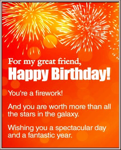 7. For my great friend, Happy Birthday! You’re a firework! And you are worth more than all the stars in the galaxy. Wishing you a spectacular day and a fantastic year.